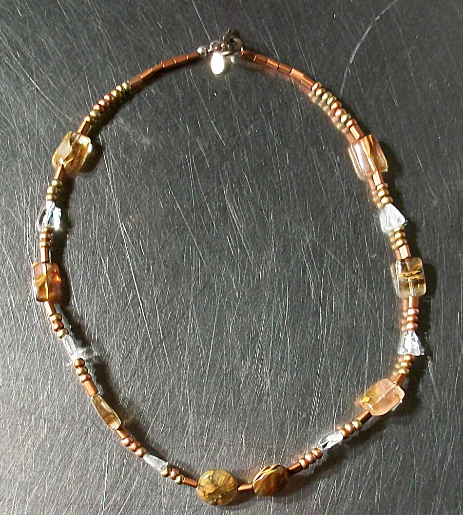 Multi colored gold glass beads with copper bead accents. Copper toggle clasp and sterling silver SUZI tag. 18"L Matching bracelet available.
