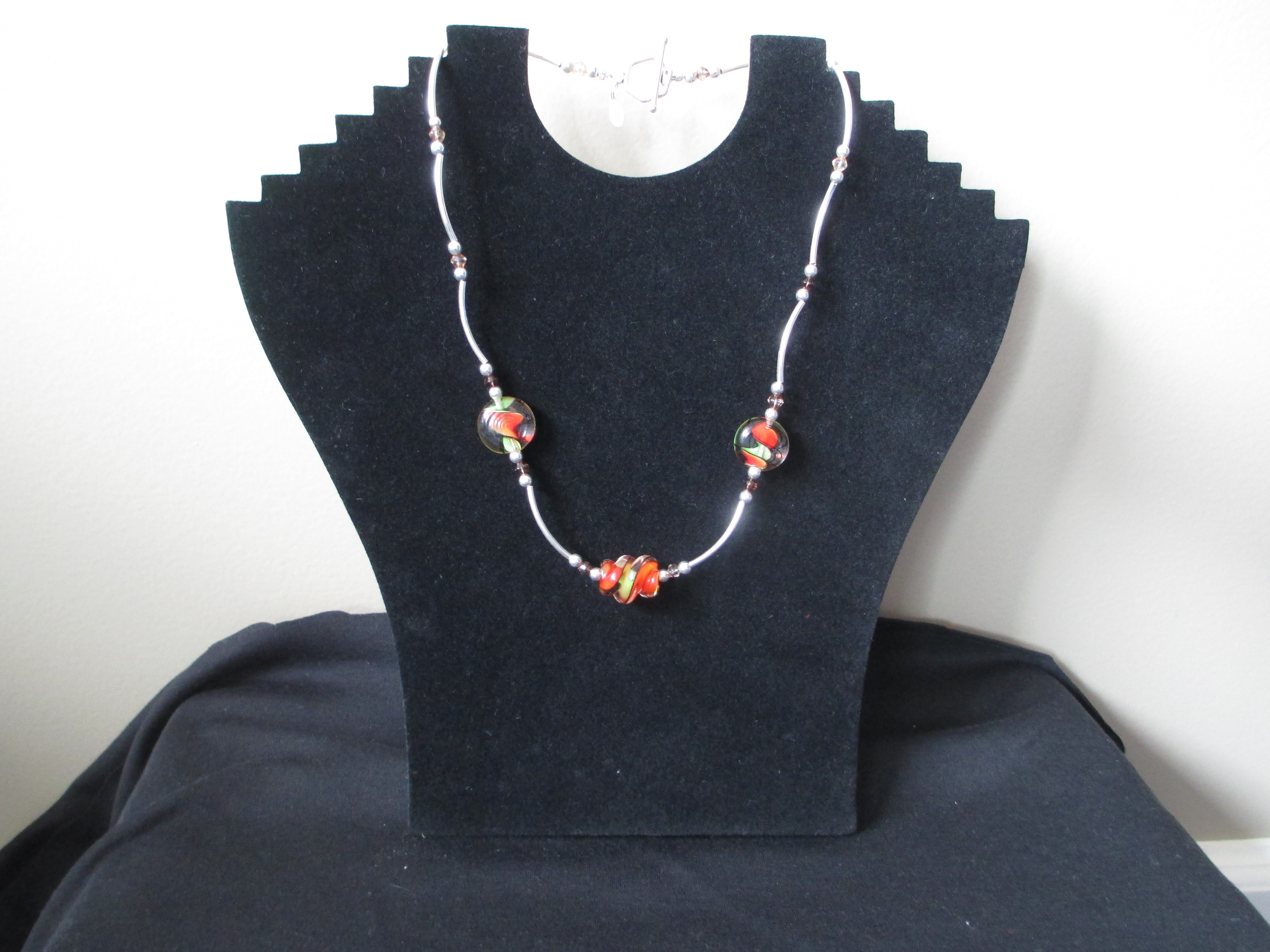 Sterling silver with glass beads. Sterling silver toggle clasp and Suzi tag. 18"L