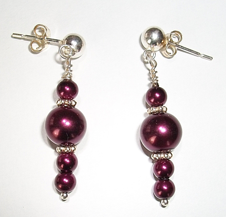 Red glass pearl earrings with sterling silver accents and sterling silver posts.