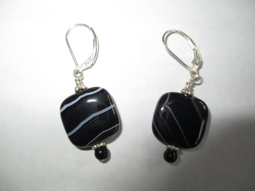 Glass beads with sterling silver accents. Sterling silver lever backs. 1 1/2" Matching necklace and bracelet available.