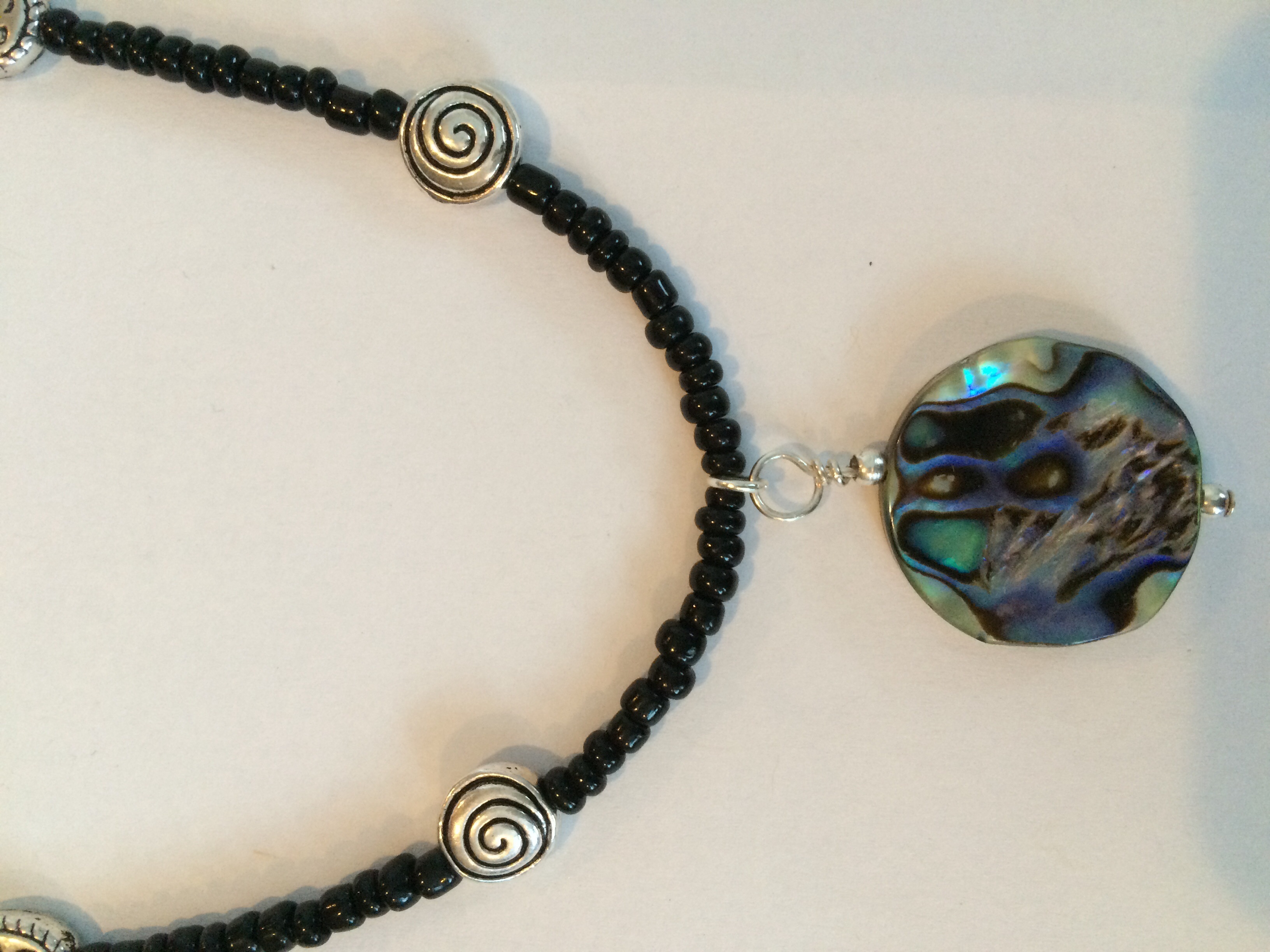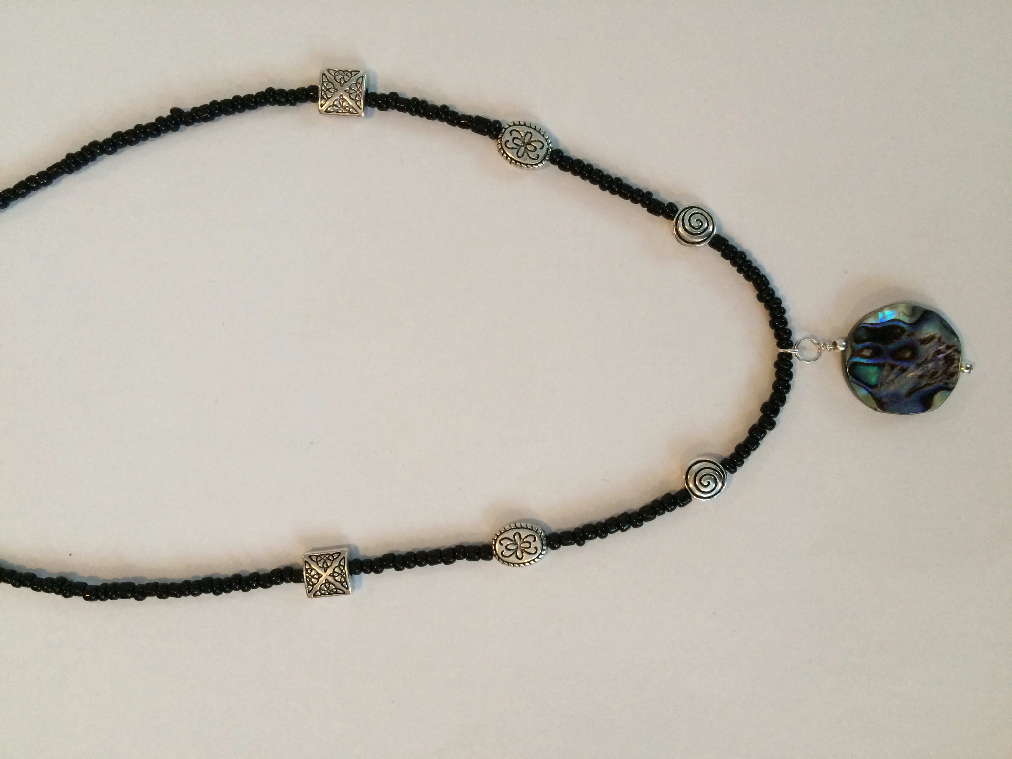 17" glass beaded necklace with tarnish resistant metal components. Abalone pendant hangs 1 1/2". Sterling silver lobster clasp and Suzi tag.
