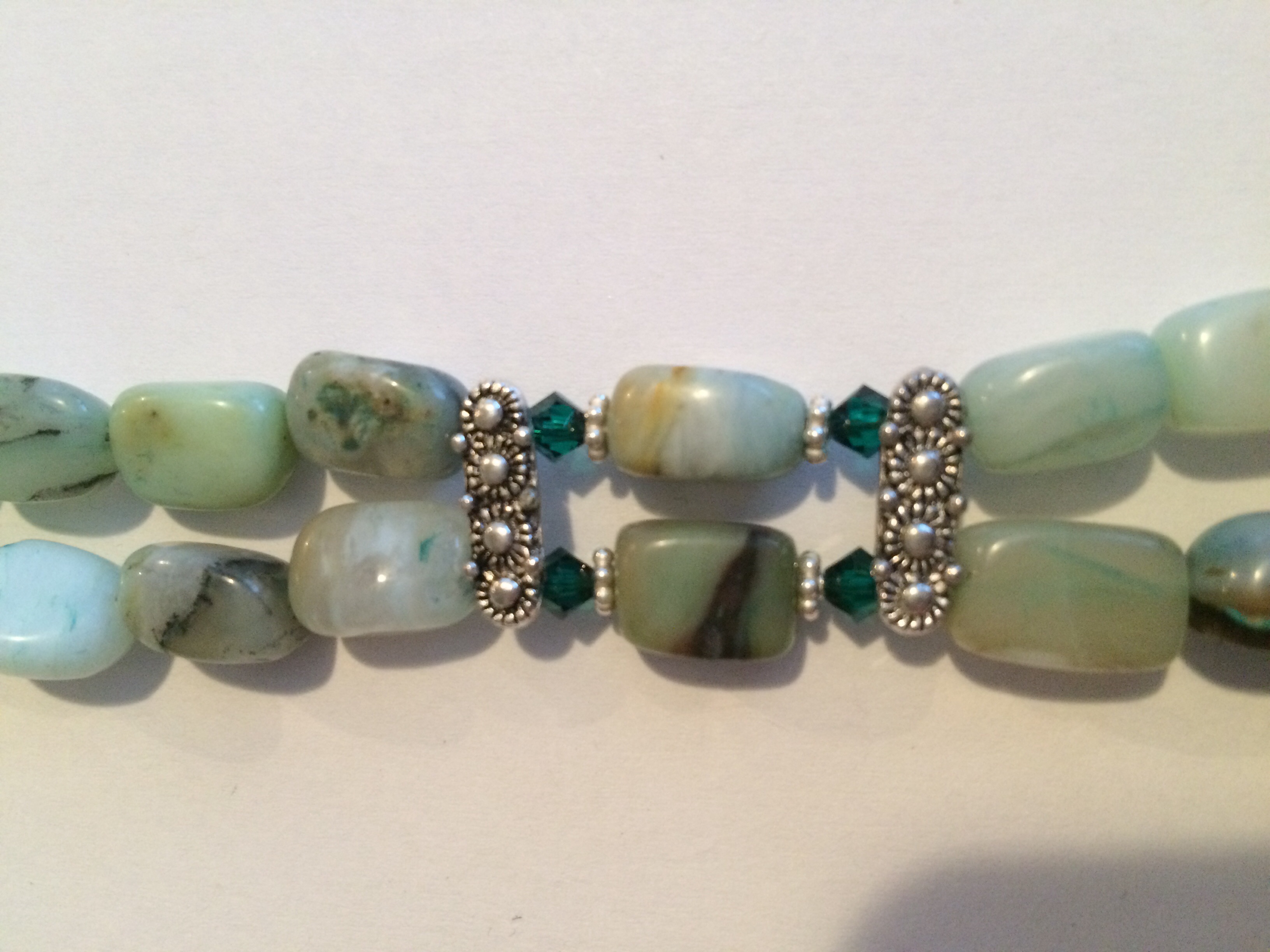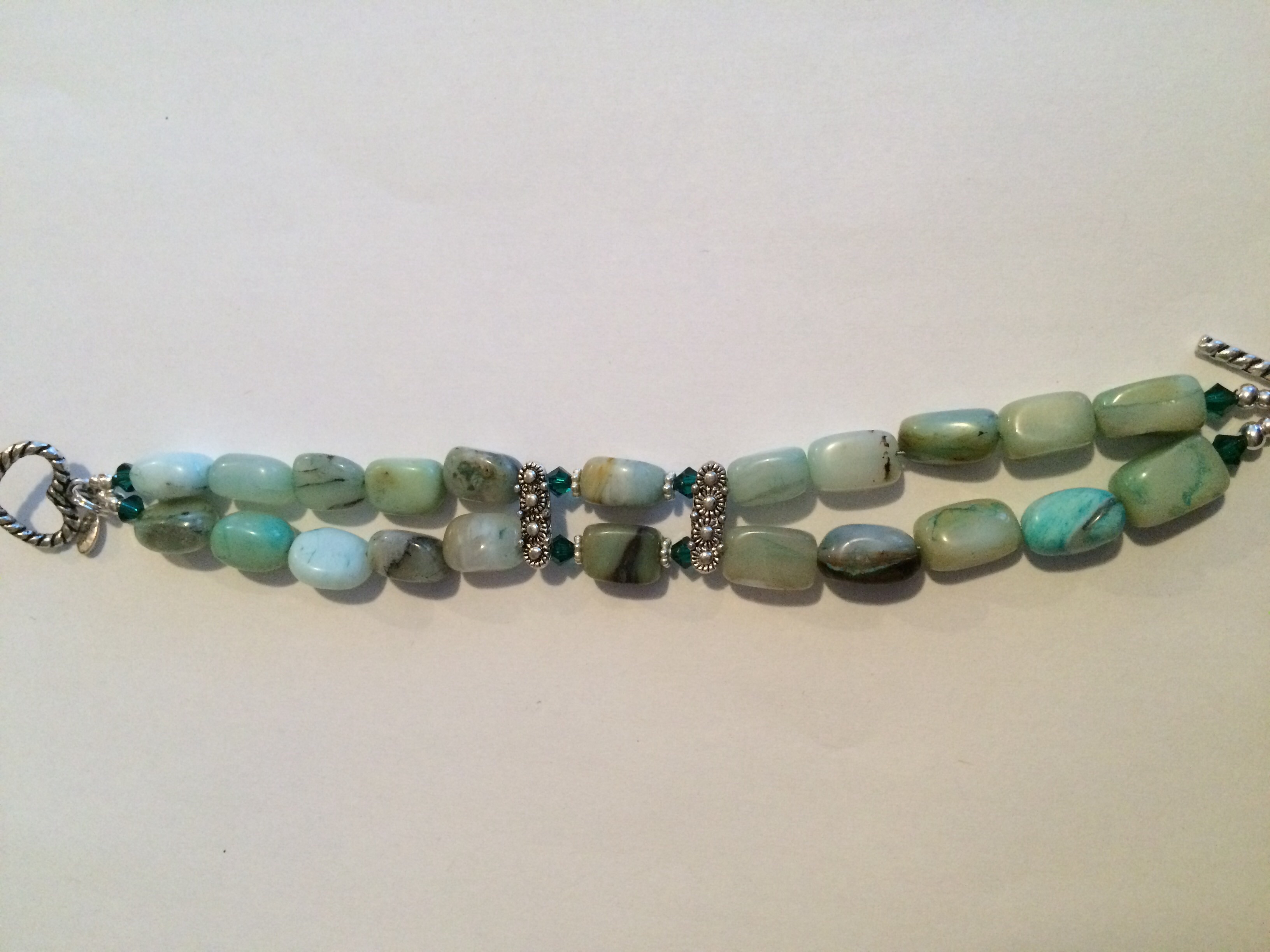 7" double stranded opal beaded bracelet. Sterling silver and pewter accents with Pewter heart toggle clasp. Sterling silver Suzi tag.