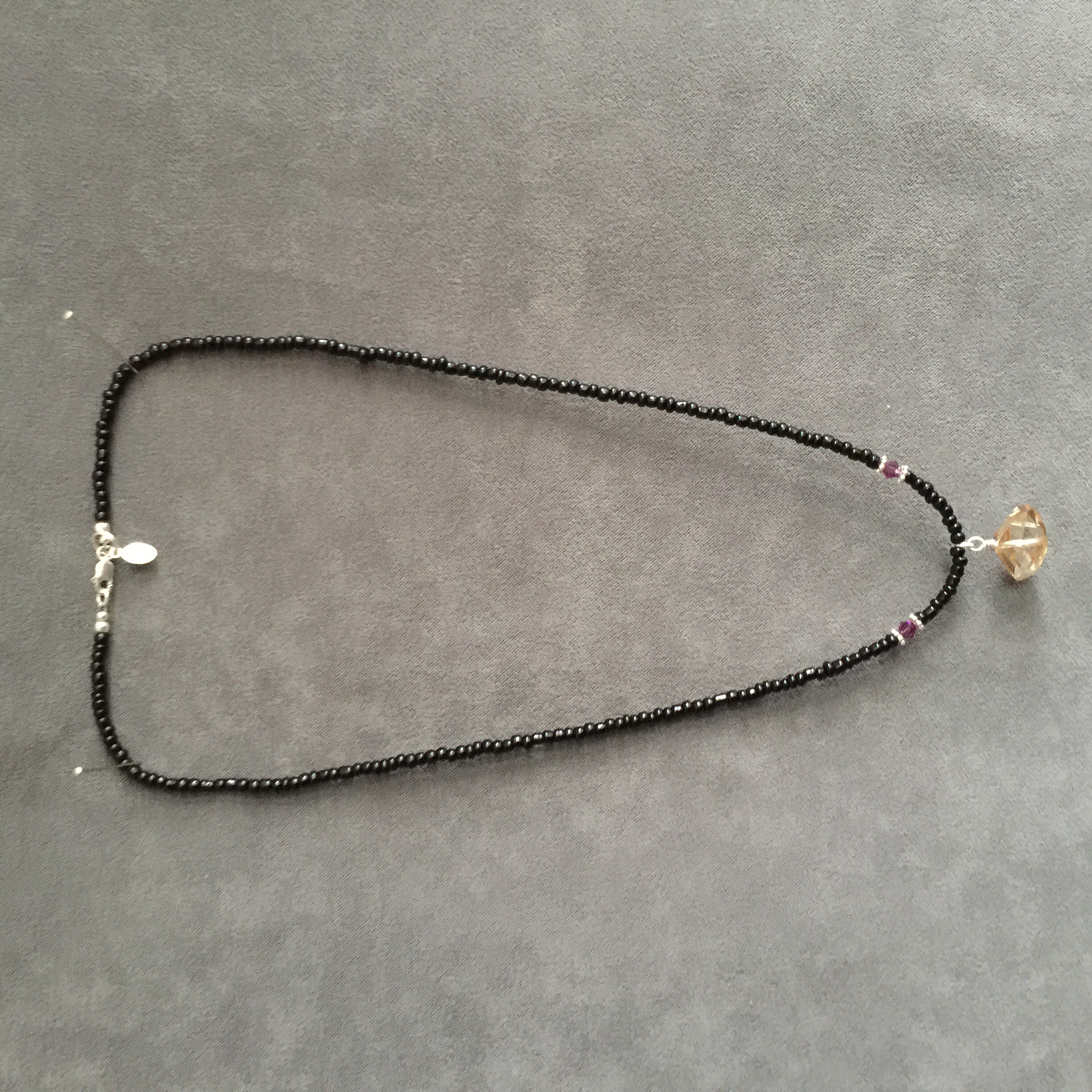 18 1/2" glass beaded necklace with swavorski crystals and sterling silver accents. 3/4" swavorski crystal pendant. Sterling silver lobster clasp and Suzi tag.