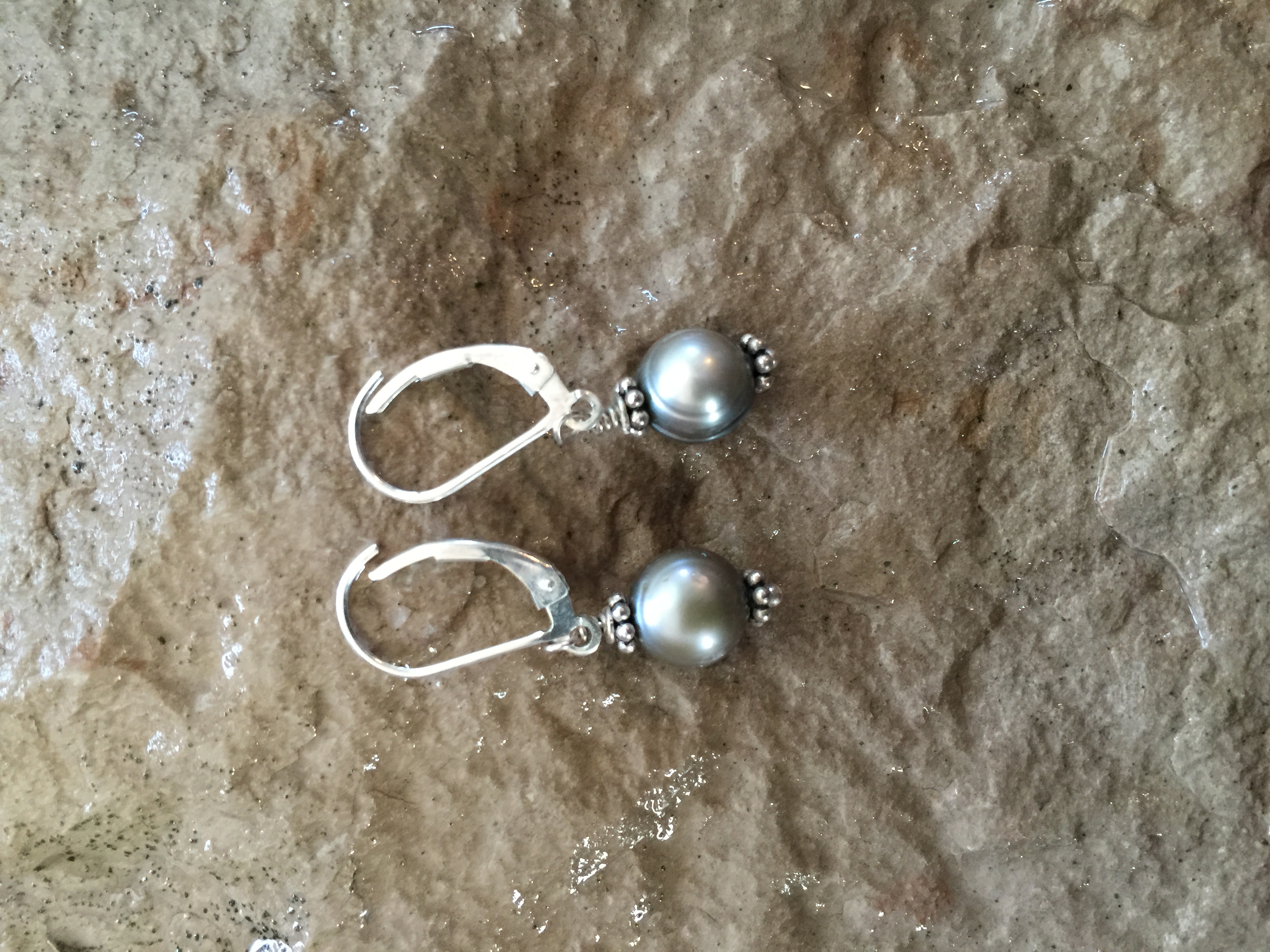 Green fashion pearl earrings. Sterling silver accents and lever backs.