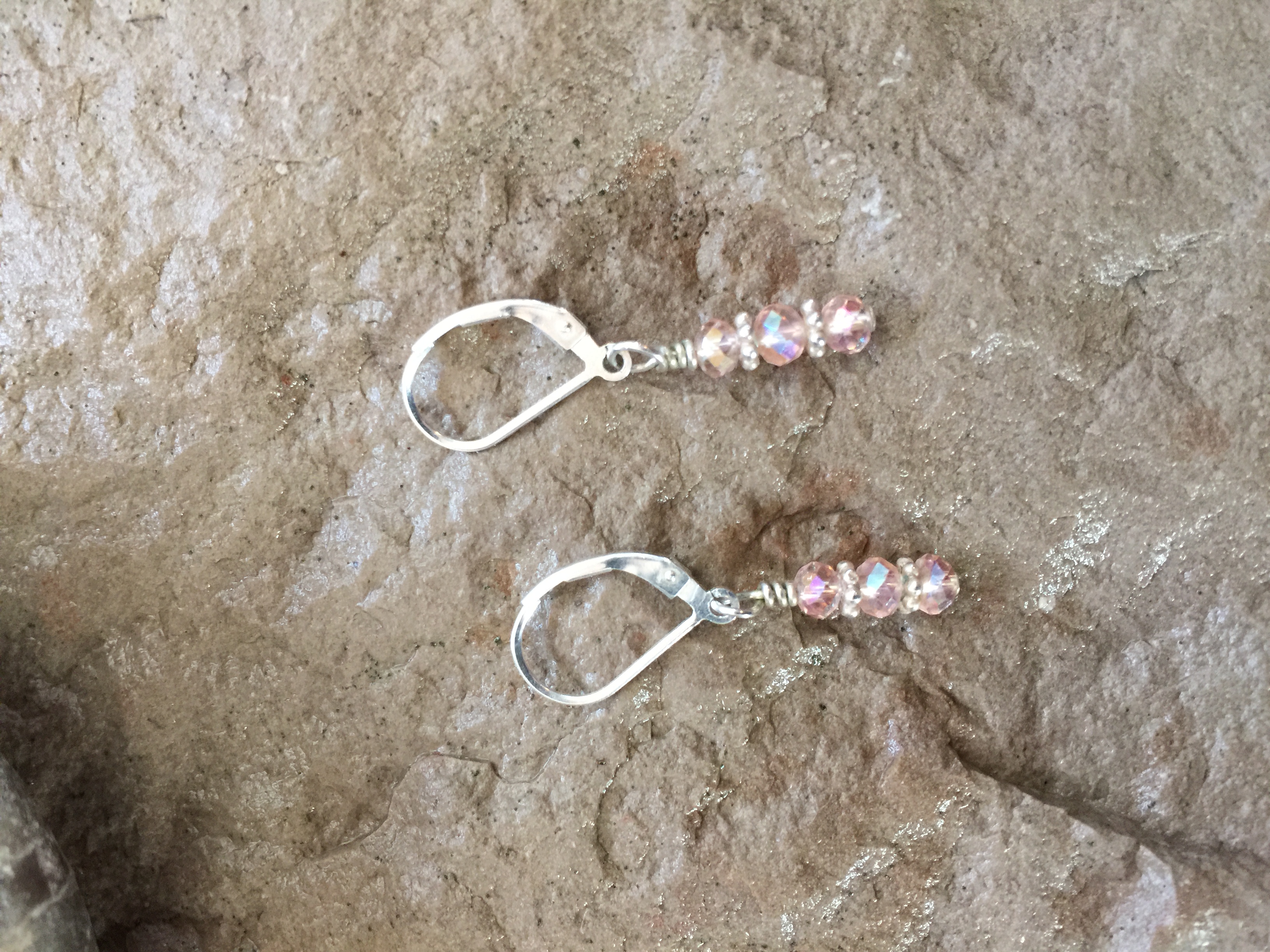 Pink swavorski crystal earrings with sterling silver accents. Sterling silver lever backs.