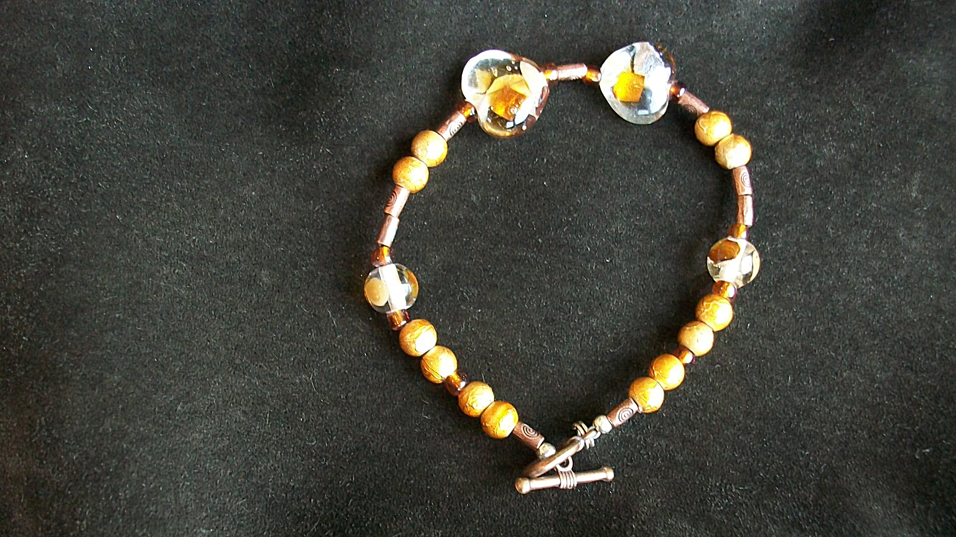 Gold glass beaded bracelet. Copper accents and toggle clasp. Sterling silver SUZI tag. 8'L Matching necklace available.