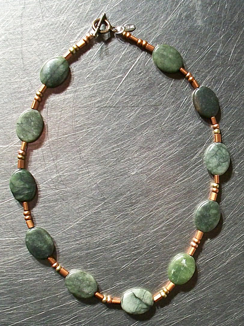 Jade and copper beaded necklace. Copper toggle clasp and sterling silver SUZI tag. 17"L Matching bracelet available.