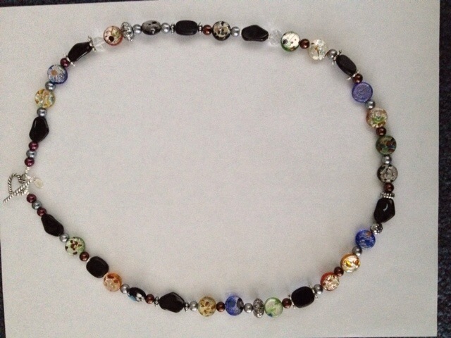 A variety of colorful glass beads with pewter and sterling silver accents. Sterling silver Suzi tag. Pewter heart toggle clasp. 25"L