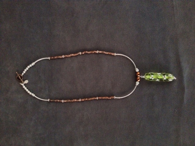Sterling silver and copper beads. Glass pendant. Sterling silver accents and Suzi tag. 17"L. 2" pendant drop.