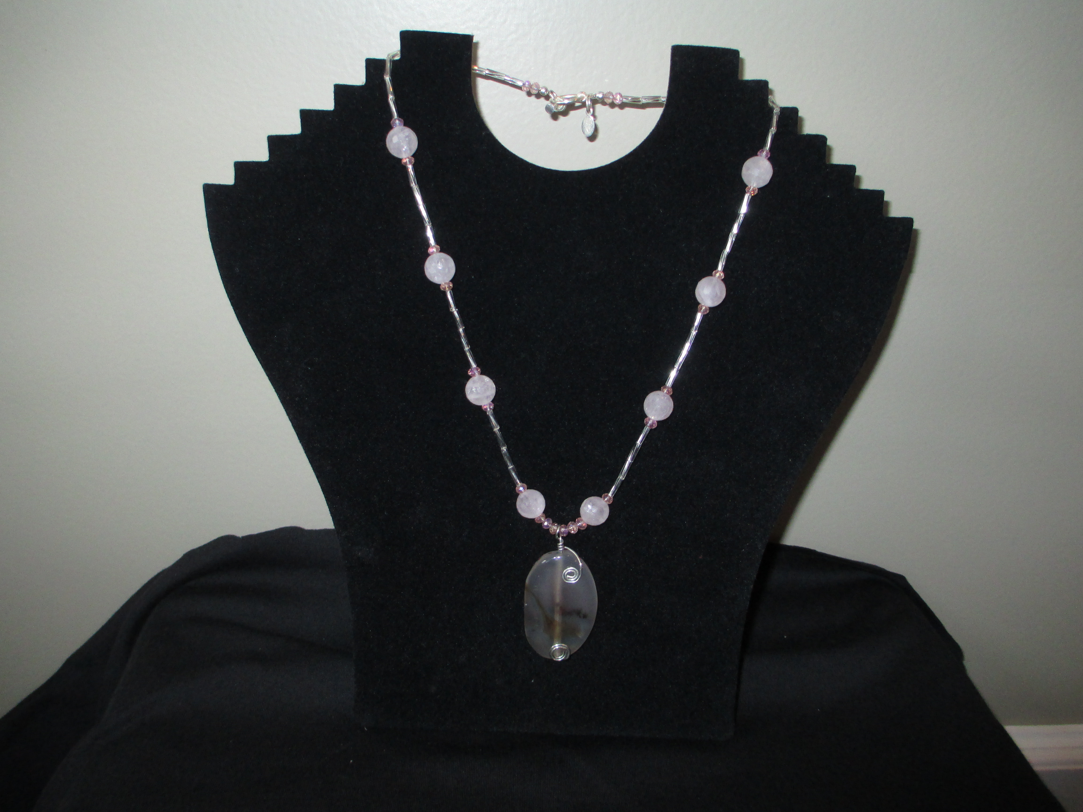 Pink quartz and glass beads. Sterling silver toggle clasp and Suzi tag. 18 1/2" L Pendant hangs an additional 2". Matching bracelet and earrings available.