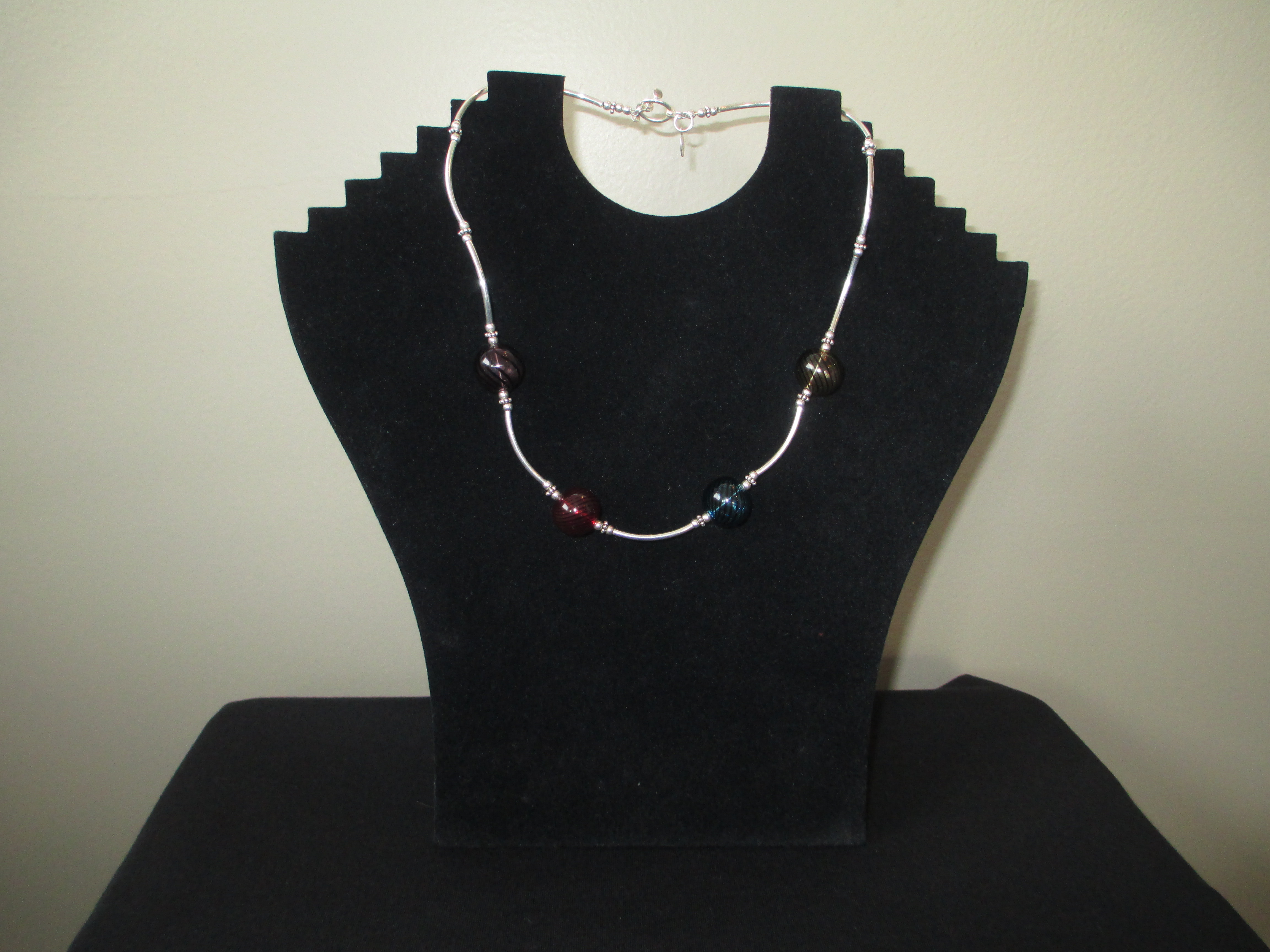Sterling silver necklace with glass beads. Sterling silver toggle clasp and Suzi tag. 17 1/2"L