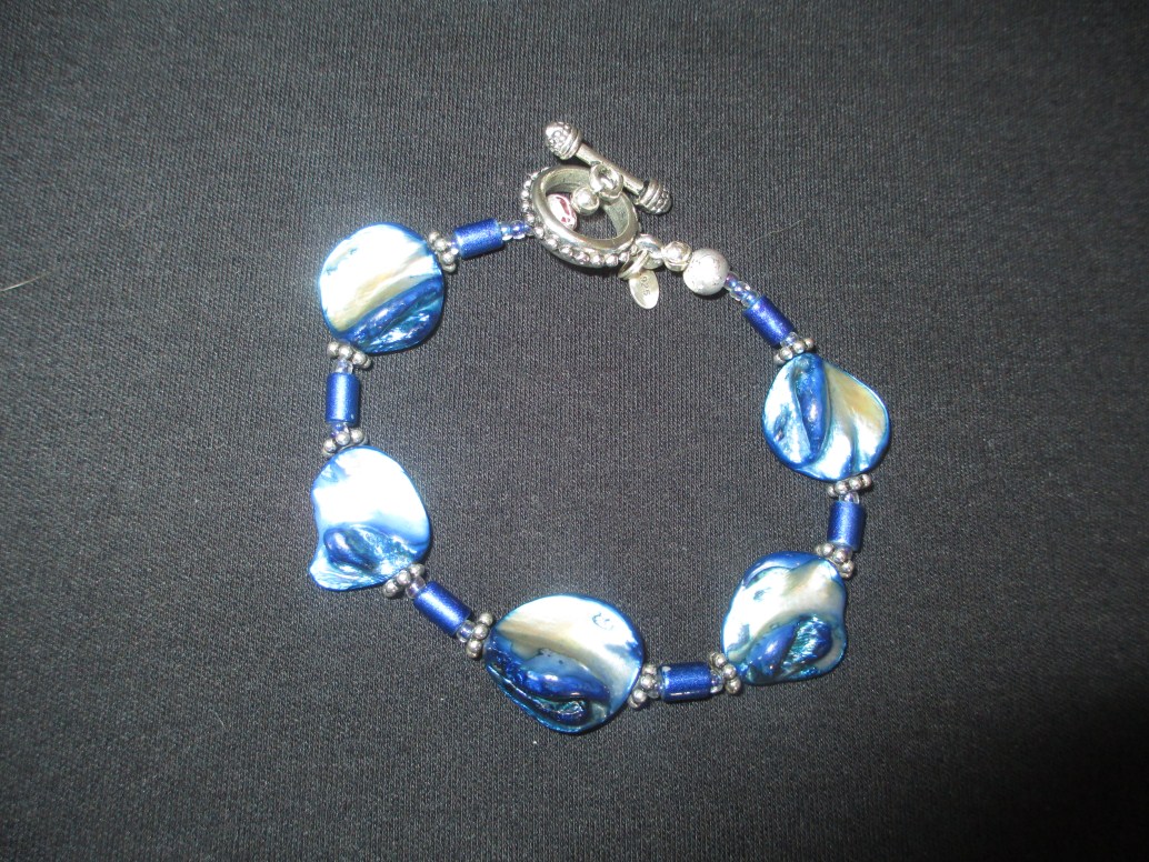 Shell and glass beads. Sterling silver accents and Suzi tag. Metal toggle clasp. 8"L. Matching necklace and earrings available.