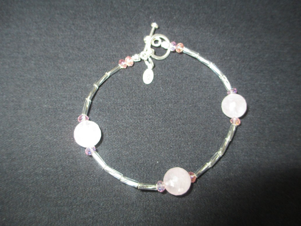 Quartz and glass beads. Sterling silver toggle clasp and Suzi tag. 7 1/2" L Matching necklace and earrings available.